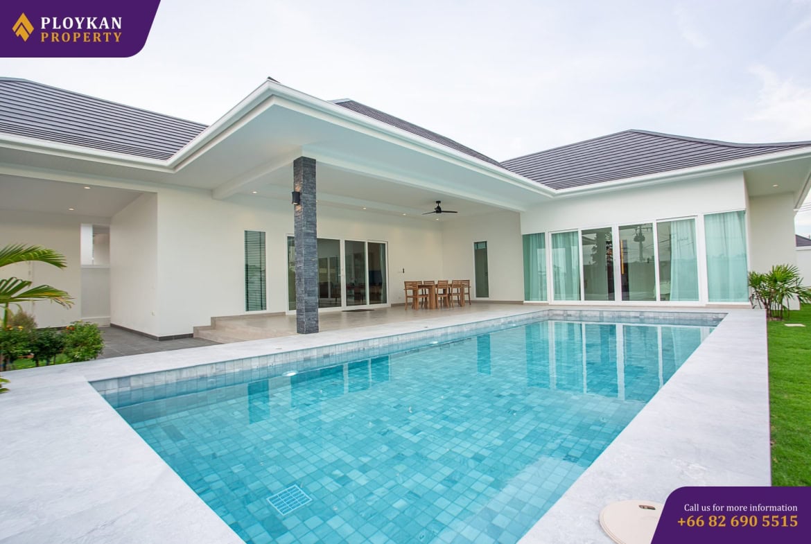 Beautiful 3 bedroom, 3 bathroom villa for sale in Hua Hin, Thailand complete with private garden and pool, large carport with storage room, 3 double bedrooms. It’s perfect for families who like spacious rooms that are designed with simplicity and elegance.